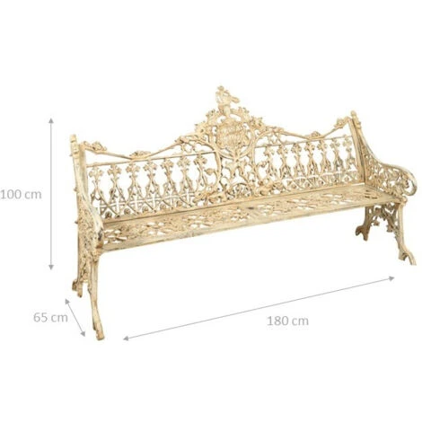 Banco muy robusto, estable y pesado fabricado en hierro fundido con unas dimensiones de 180 cm de ancho, 65 cm de profundidad y 100 cm de altura, con un cuidado acabado totalmente artesanal, consiguiendo un auténtico efecto envejecido. Elaborado meticulosamente, reproduce el diseño de los antiguos bancos ingleses y franceses del siglo XIX. Amuebla con elegancia cualquier ambiente interior o exterior. Todas las medidas se refieren al tamaño máximo del artículo.