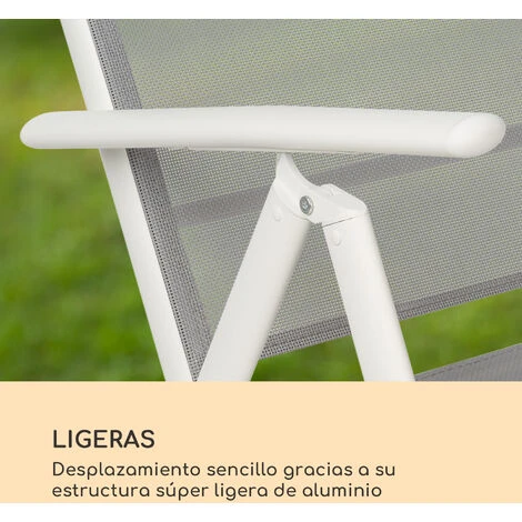 Las sillas plegables Almeria Garden Chair de Blumfeldt ofrecen asientos de máxima flexibilidad: gracias a los respaldos regulables en 7 posiciones, puedes recostarte y relajarte después de un día de trabajo para disfrutar del aire fresco y de la luz del sol, o charlar sentado con tus amigos y familiares en el jardín. Los revestimientos de tejido de los asientos y los respaldos ultraaltos son transpirables gracias a su estructura de malla 2×2 – ideal para cenas largas y momento de relax. Para que la intemperie no estropee las sillas, los revestimientos son resistentes al agua y rápidos de secar. Los robustos tubos de aluminio con recubrimiento de polvo resistente a la intemperie aseguran la estabilidad de los marcos. De este modo, podrás disfrutar de las sillas de jardín durante mucho más tiempo. Asimismo, las sillas Almeria Garden Chair de Blumfeldt cuentan con unas dimensiones muy compactas, por lo que las puedes guardar en cualquier lugar cuando están plegadas. Del mismo modo es muy fácil combinarlas según la ocasión: varias sillas cuando tengas la próxima fiesta y una o dos si lo que quieres es relajarte y disfrutar del verano solo o en pareja.