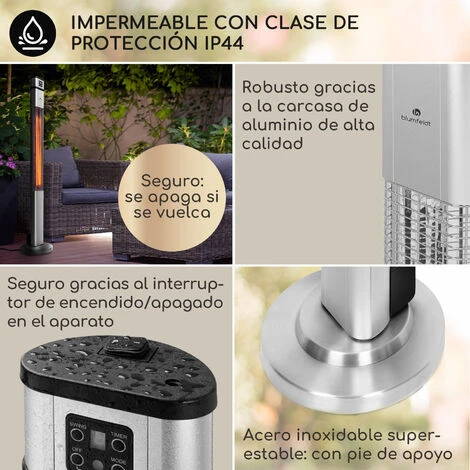 La estufa no solo calienta en 3 intensidades, baja, mediana y alta: gracias al mecanismo de rotación integrado, el radiador presenta una oscilación horizontal de 60º para calentar a la vez a muchas más personas. Un elemento calefactor de carbono y la tecnología IR ComfortHeat garantizan una potencia de 2000 W y un calentamiento efectivo. Un temporizador programable entre 1 y 9 horas permite apagar el aparato de forma automática. La estufa por infrarrojos se controla a través de los botones con un display digital o mediante un mando a distancia suministrado en el envío. Gracias al grado de protección IP44, el radiador con una carcasa de aleación de aluminio anodizado está protegido contra las salpicaduras de agua y es apto para utilizarse en el exterior. Debido a sus dimensiones compactas y a su poco peso, es altamente móvil y puede utilizarse allí, donde más se le necesita.