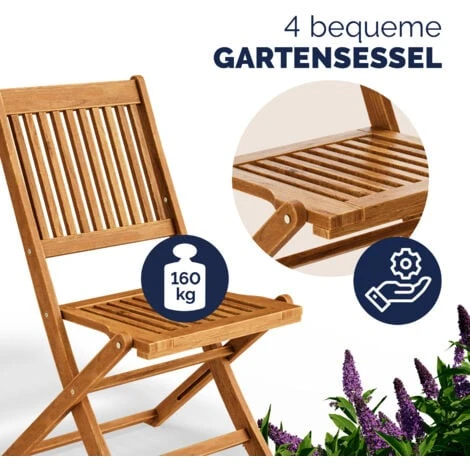 El juego de asientos Sydney light, esta hecho de madera maciza de acacia con certificado FSC®, y convence por su elegante diseño y funcionalidad. El conjunto de jardín esta compuesto de una mesa y cuatro sillas plegables.