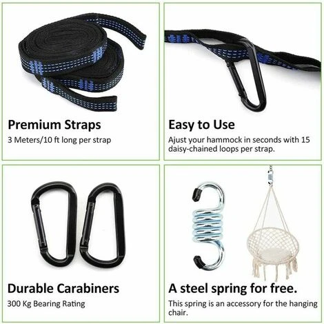Ajustable y flexible: cada correa de sujeción tiene 300 cm de largo y 2,5 cm de ancho. Tiene 16 anillos y la longitud se puede ajustar fácilmente a diferentes distancias. Encuentra fácilmente la ubicación perfecta para una hamaca.