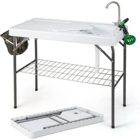 La mesa plegable para limpiar pescado está diseñada con un práctico fregadero para limpiar, un grifo de agua giratorio 360° y una cómoda boquilla de pulverización. Además, existe un conector de 3 vías para conectar el grifo con la boquilla de pulverización y la manguera de jardín estándar de 12,7 mm (no incluida), y una manguera extensible para drenar el agua.