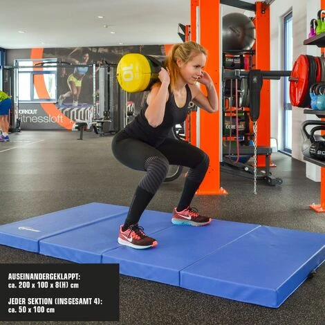 Las cuatro secciones están hechas de espuma EPE (polietileno expandido) recubiertas de PVC impenetrable al sudor y la saliva. Tamaño total: aprox. 200x100x8cm, tamaño plegada: aprox. 50x100x32cm, peso: aprox. 4,05 kg.