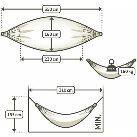 | | Numerosos cordones de sujeción | El número de cordones de sujeción influye en la comodidad y a la durabilidad de una hamaca. Cuantos más sean, más uniformemente se distribuirá el peso. ¡Disfruta de una sensación de ingravidez! |
